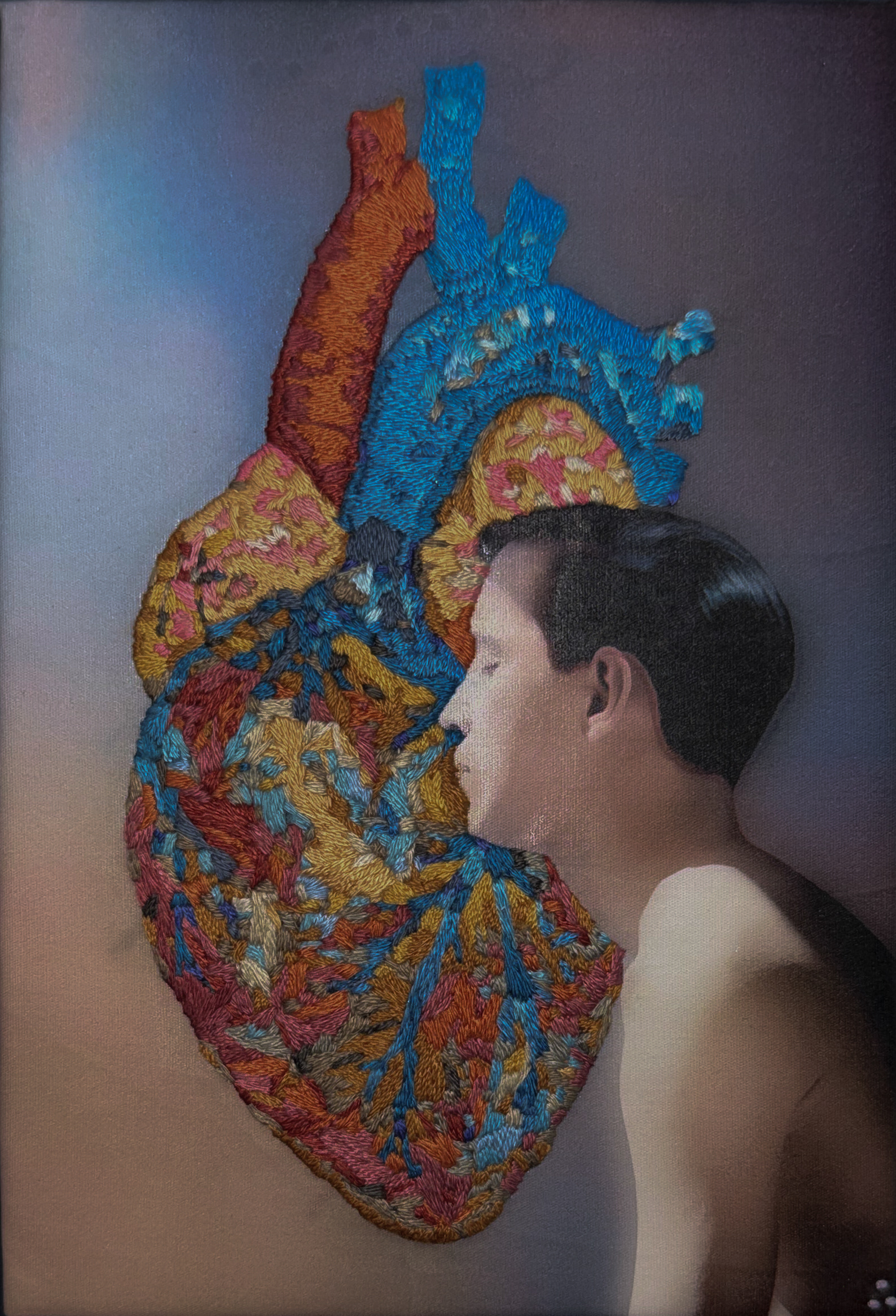 Silent Pulse brings together a vintage photograph and embroidered heart to reflect the concealed rhythms of queer love from the 1950s to 1970s—a time when being oneself meant living with longing in silence. The colour-coded, anatomical heart stands for not just vulnerability and endurance, but the silent pulse of forbidden affection, quietly persisting beneath the surface.